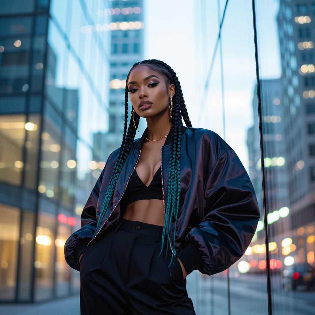 A striking fashion editorial featuring Lyra with radiant dark skin and knotless braids. She wears a satin jacket against a vibrant, light-reflecting cityscape, captured with cinematic realism.