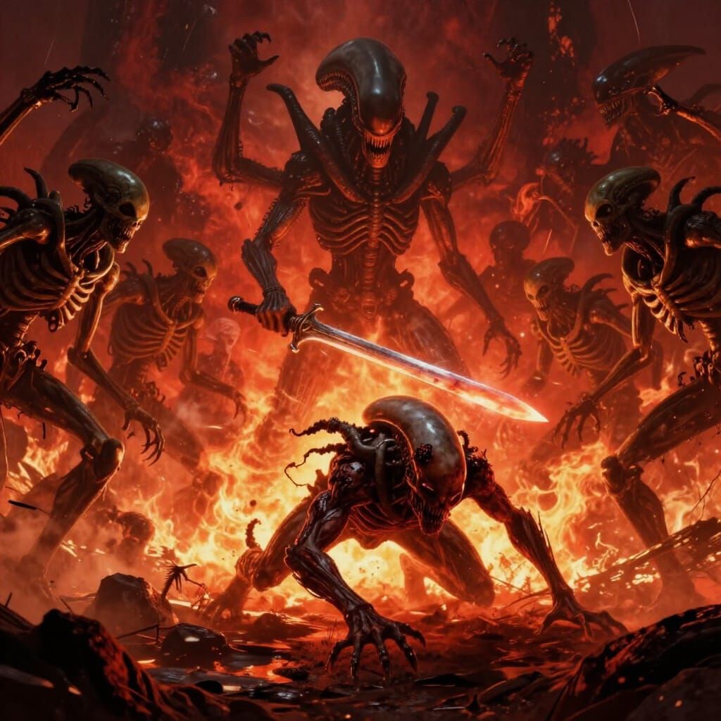 A hellish scene depicts a zombie rising from Earth's core, with skeletons and aliens worshipping Satan. A Xenomorph with a sword fights the horde in dark fantasy concept art.