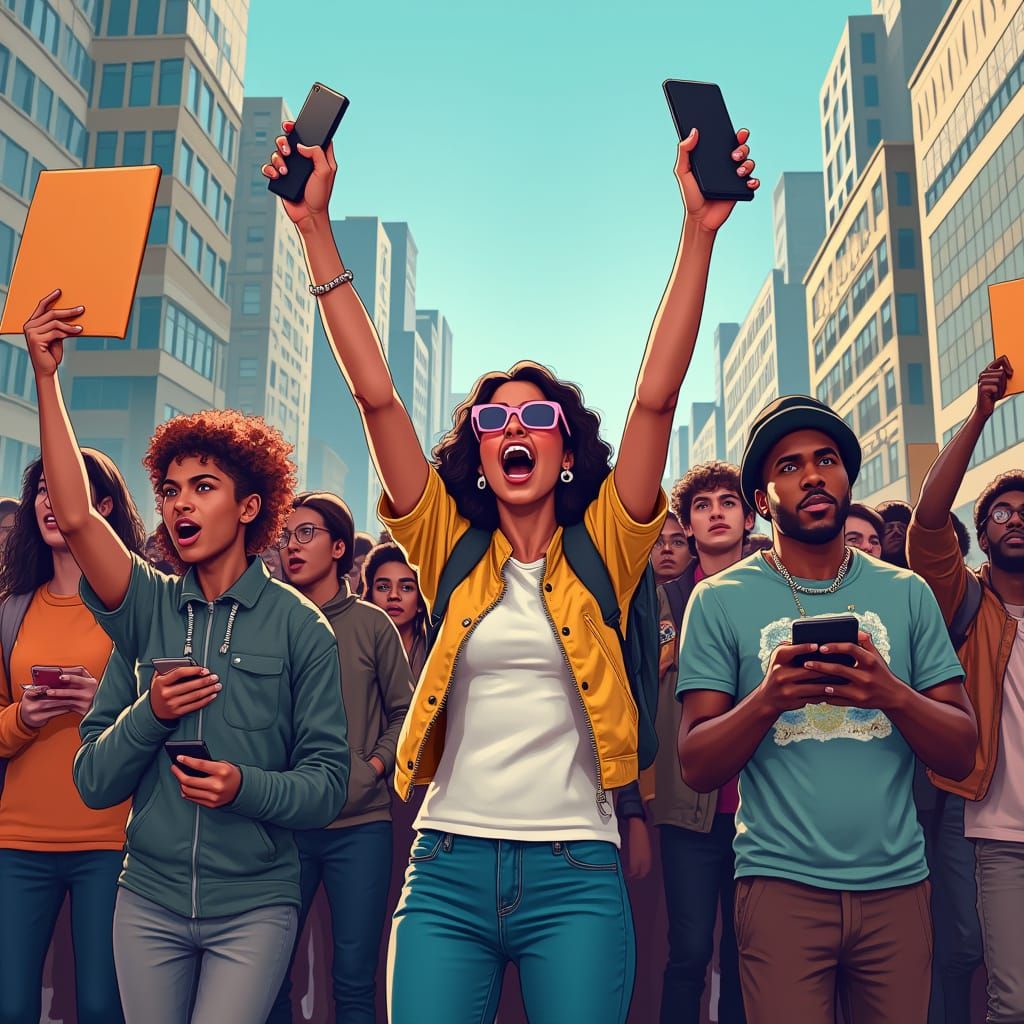 A vibrant image showing protesters in streetwear rallying against traditional banking in a cityscape. The scene blends digital painting and graphic design elements in a stylized aesthetic.