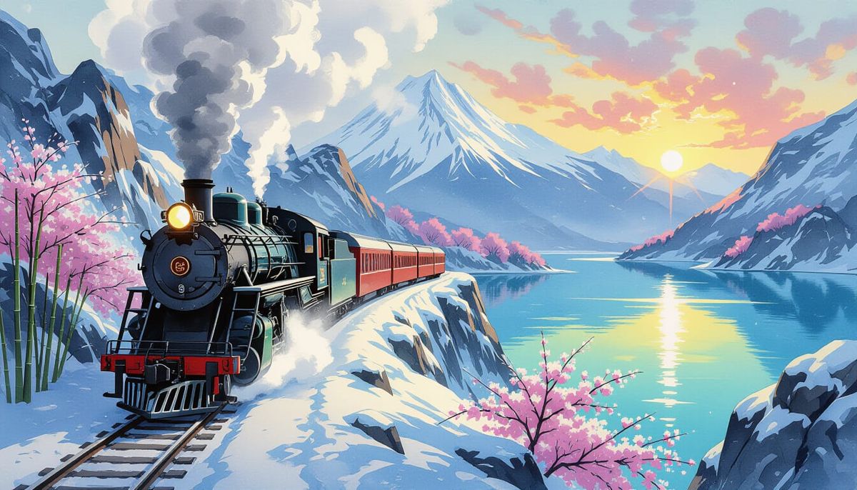 This image depicts a vibrant steam train on a snow-covered mountain, with a distant turquoise lake and cherry blossoms. The artwork features dynamic lighting and pastel colors, reminiscent of classic illustration.