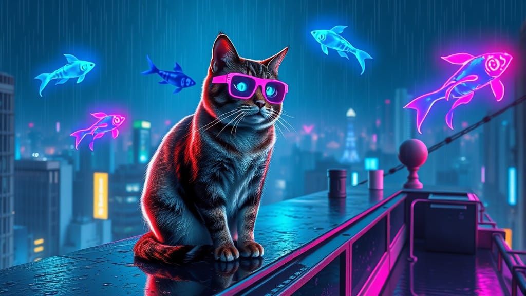A cyberpunk cat with glowing eyes wears neon sunglasses on a rainy Tokyo rooftop. Holographic koi swim in the night sky, presented in a vibrant synthwave style.