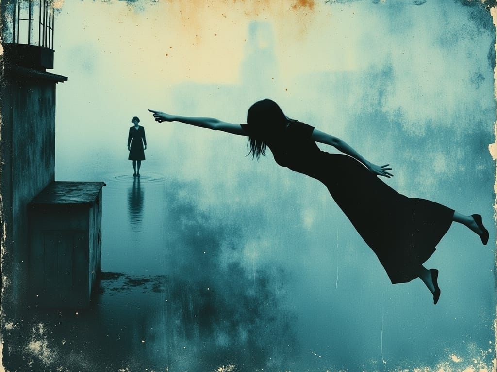 This image captures a poignant, metaphorical break-up scene as a double exposure over a Japanese cityscape silhouette. Rendered in a surrealist, oil painting style with somber blues and greys, evoking emotional intensity.