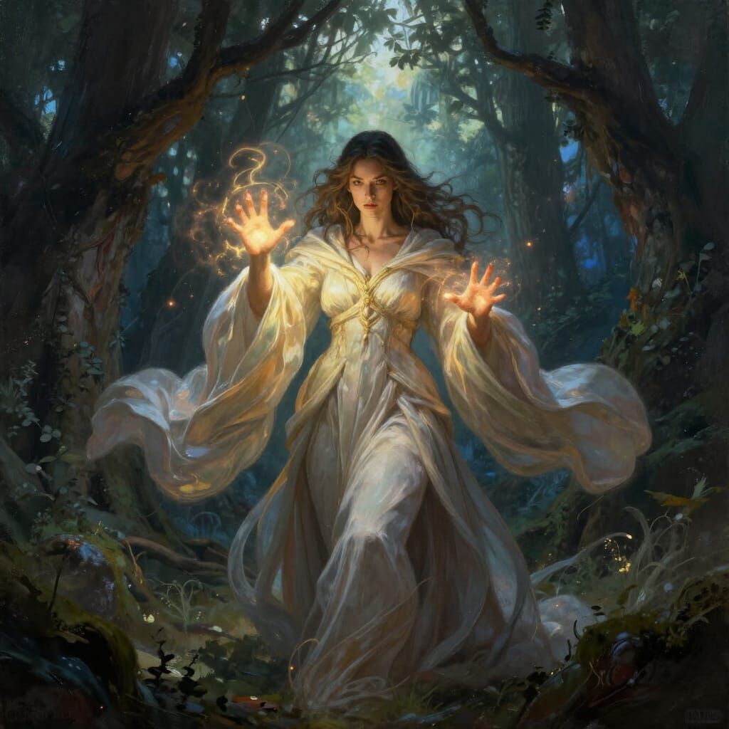 A powerful sorceress in dark fantasy style, casting a radiant spell with glowing hands in a mystical forest at twilight. Digital art with dramatic lighting and rich atmosphere.