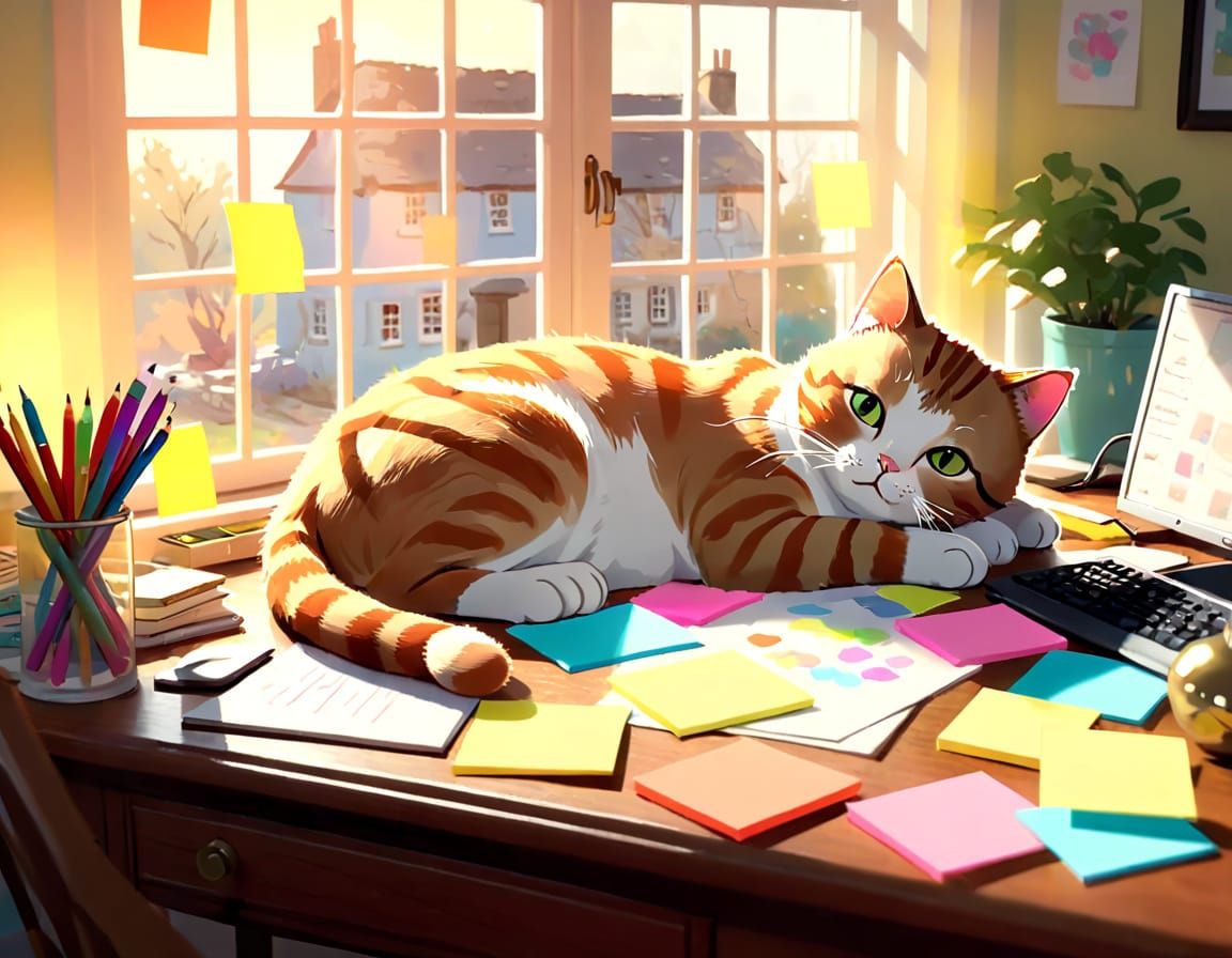 This image shows a cat lounging on a cluttered desk amidst colorful sticky notes and scattered office supplies. It is a warm and inviting digital illustration in a Beatrix Potter-esque style.