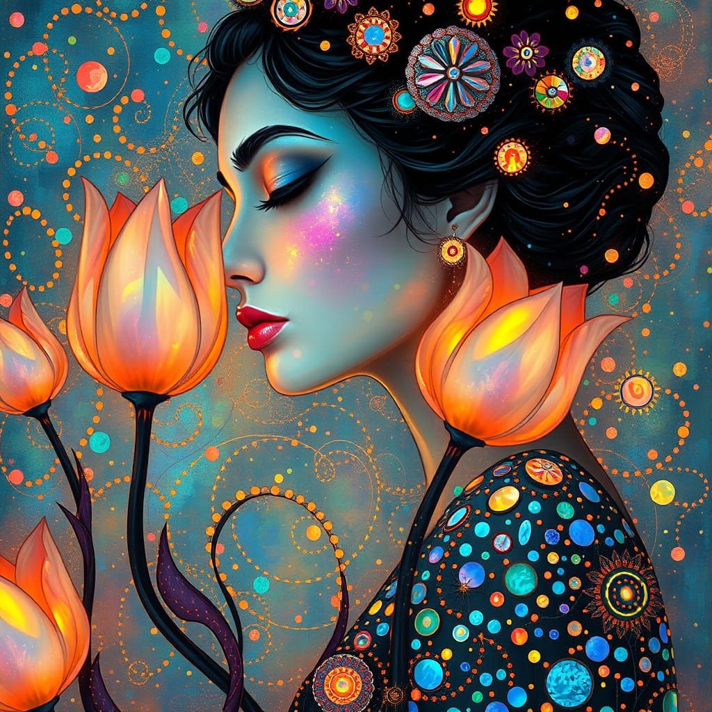 This image shows an ethereal, whimsical goddess surrounded by intricate, abstract patterns and vibrant colors reminiscent of Art Nouveau and Op Art. Whimsical, dreamlike quality and delicate, ethereal light create a mesmerizing effect.