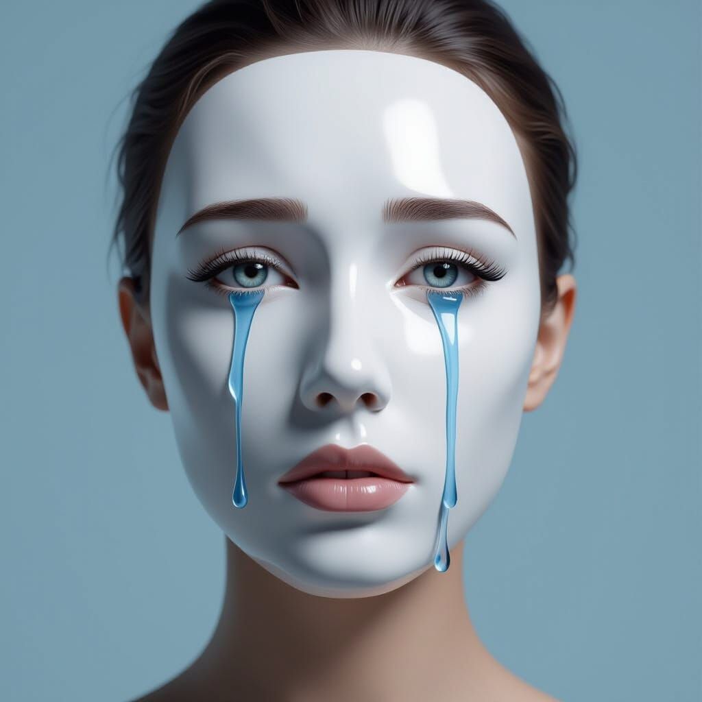 A close-up image shows a tear rolling down a mask, illuminated by volumetric lighting. This minimalist composition conveys hidden emotions behind a facade.
