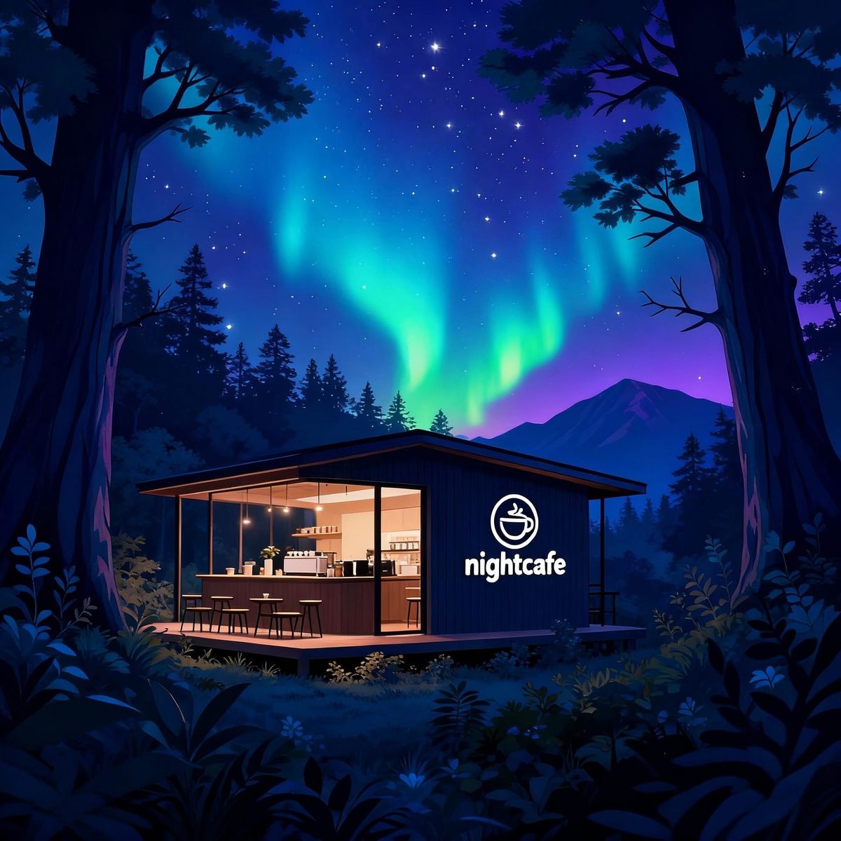 This AI-generated image depicts a serene nature tea cafe featuring the distinctive Nightcafe logo prominently displayed. The scene blends natural elements with branding.