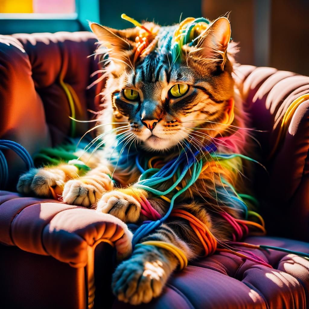 A macro photograph of a cat with fur made of colorful strings, sleeping on an armchair. The surreal image uses vibrant, dreamlike colors with melting objects and juxtaposed textures.