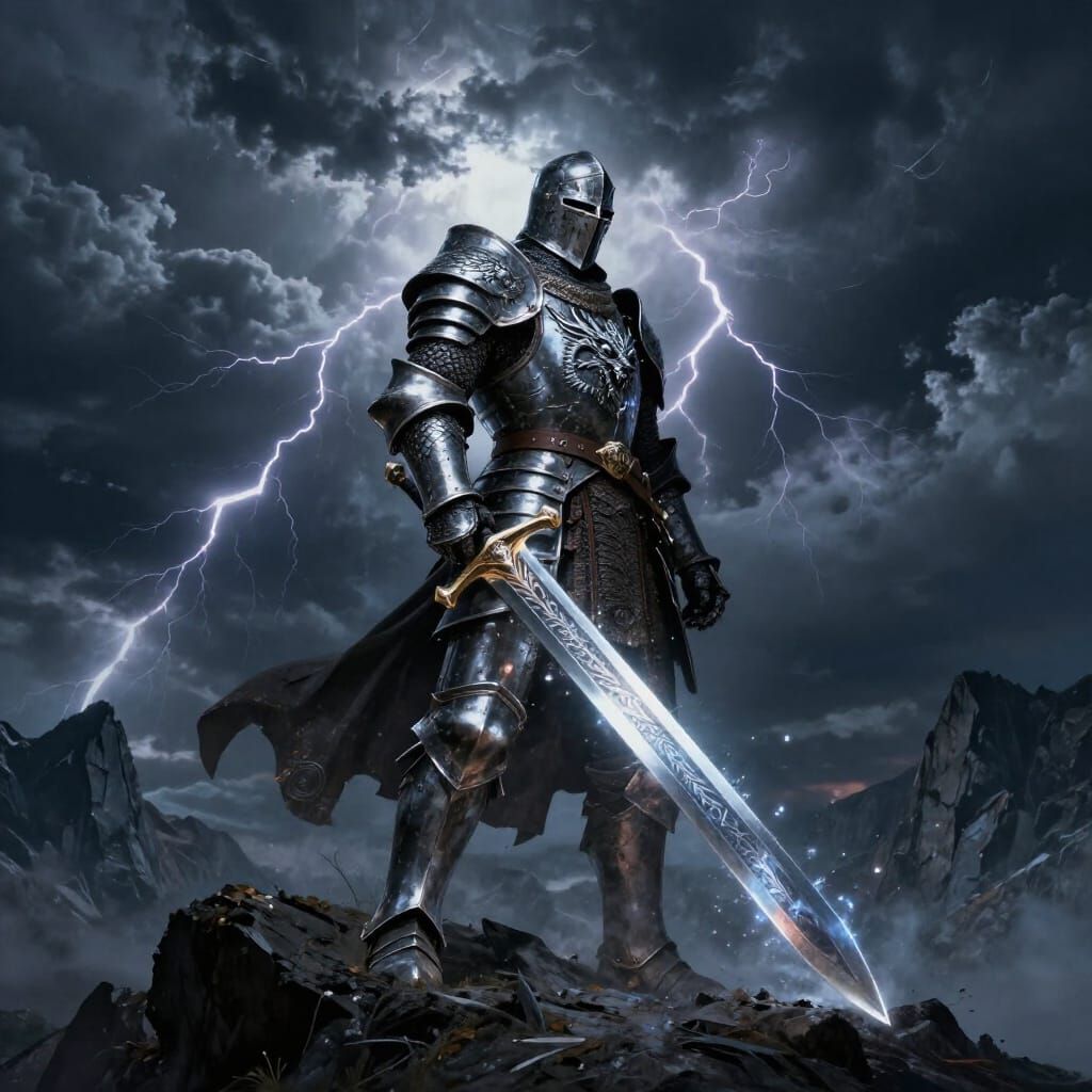 A dark fantasy concept art piece featuring a knight in dragon-scale armor on a stormy mountain, wielding a powerful glowing sword. Dramatic lighting and deep colors create an epic atmosphere.