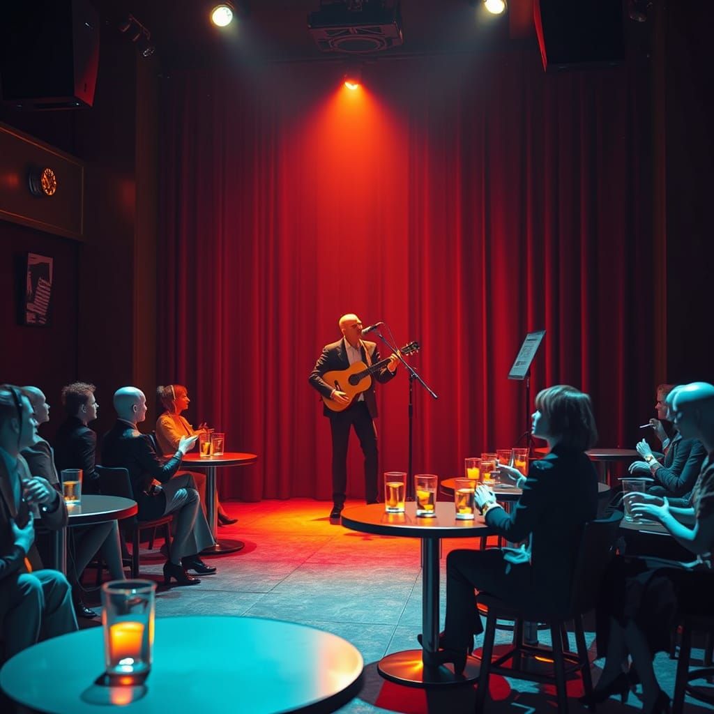 A softly lit stage features a singer performing to a crowd of mannequins. The image captures a retro-futuristic noir mood with a dreamlike cabaret aesthetic.