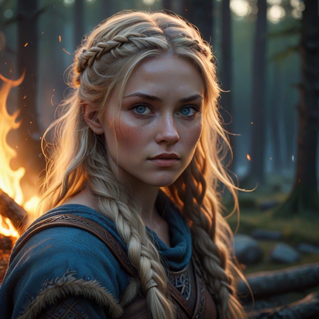 A young Viking woman sits serenely beside a campfire, her blonde hair and bright blue eyes illuminated by warm, golden flames. Soft shadows dance across her face, set against the muted colors of a Nordic wilderness.