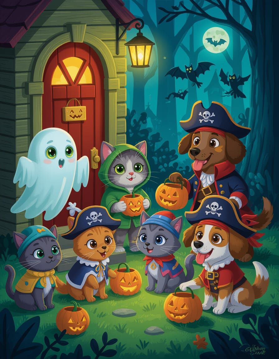 This image shows various forest animals dressed in creative Halloween disguises, like ghostly cats, vampire owls, and pirate dogs, preparing to go trick-or-treating together.