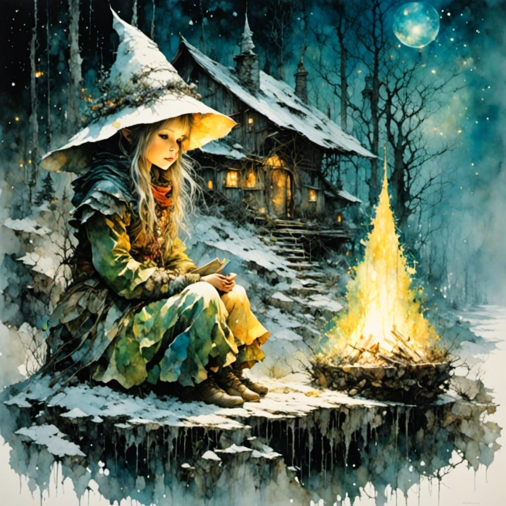 A striking picture of a young gnome girl in a charming gnome village. She sits by a fire, carefully polishing a large crystal in this peaceful scene, reminiscent of fantasy art.