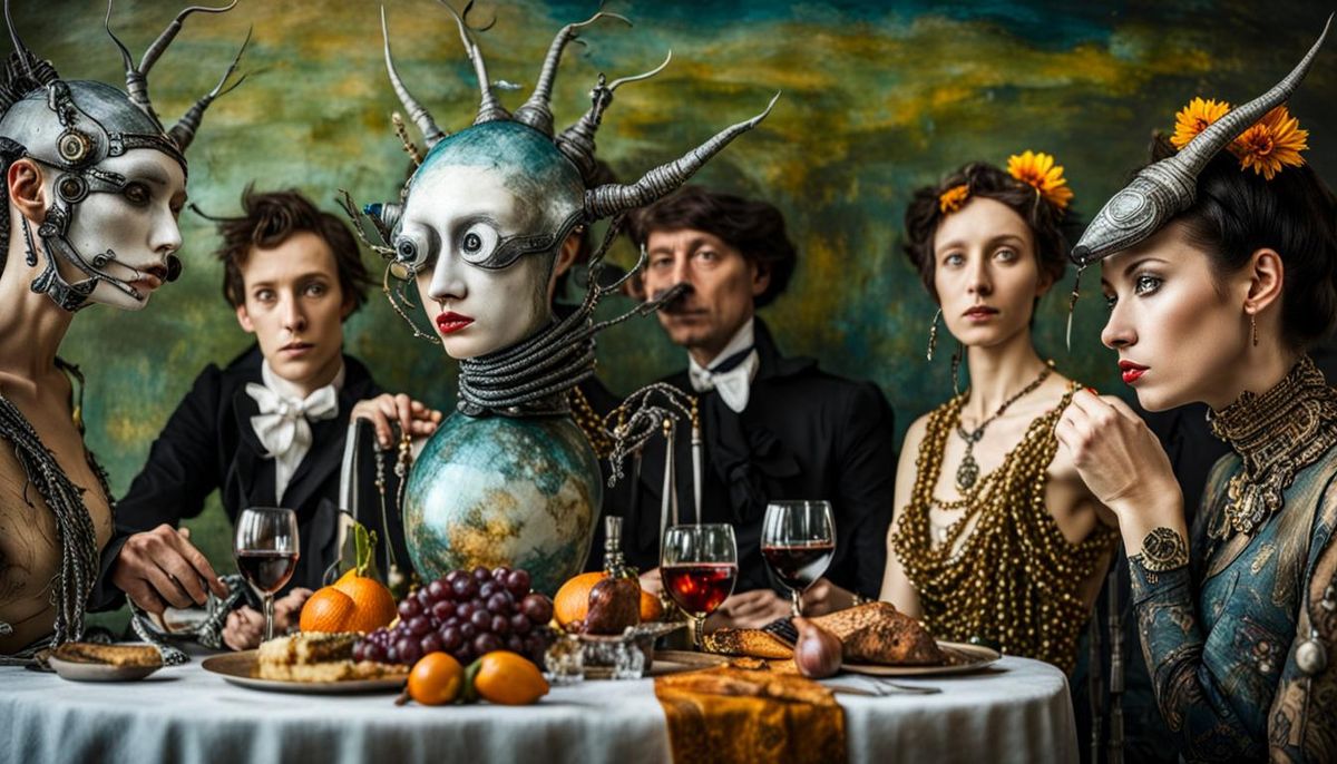 professional photography Surreal Restaurant setting with beautiful aliens exotic strange extra-human beautifully dressed eating and drinking and celebrating with their fellow aliens and people with a difference strange and wonderful creatures tablecloths china crystal many flowers within the Restaurant ...