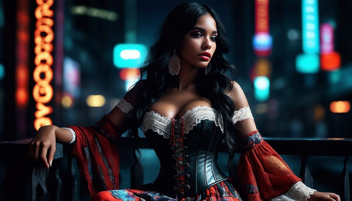 A striking picture of a young woman in a gypsy dress, seated against a neon-lit cityscape background. The image is rendered as vivid digital art with dramatic lighting and triadic colors.
