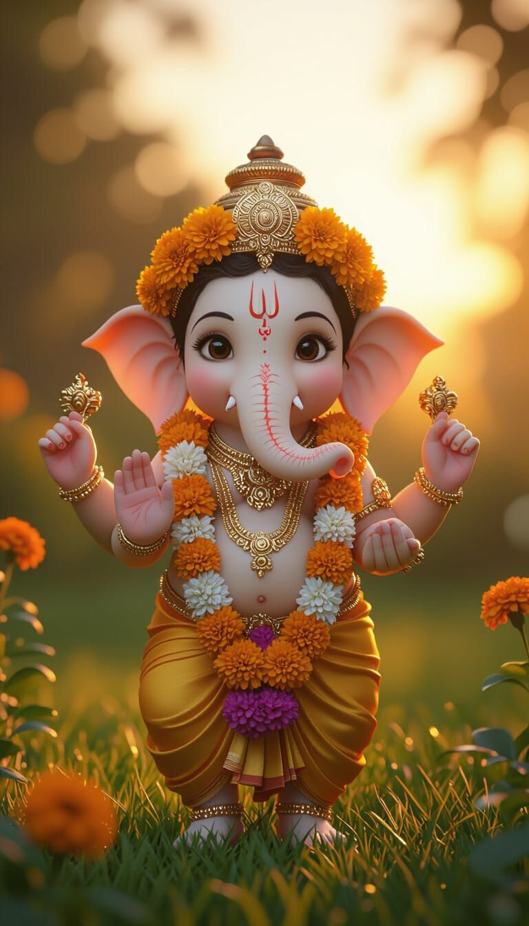 This 3D rendered image shows a cute baby Lord Ganesha playing in a vibrant green garden during a golden sunset. He is adorned with floral elements, presented with smooth animation and soft lighting.