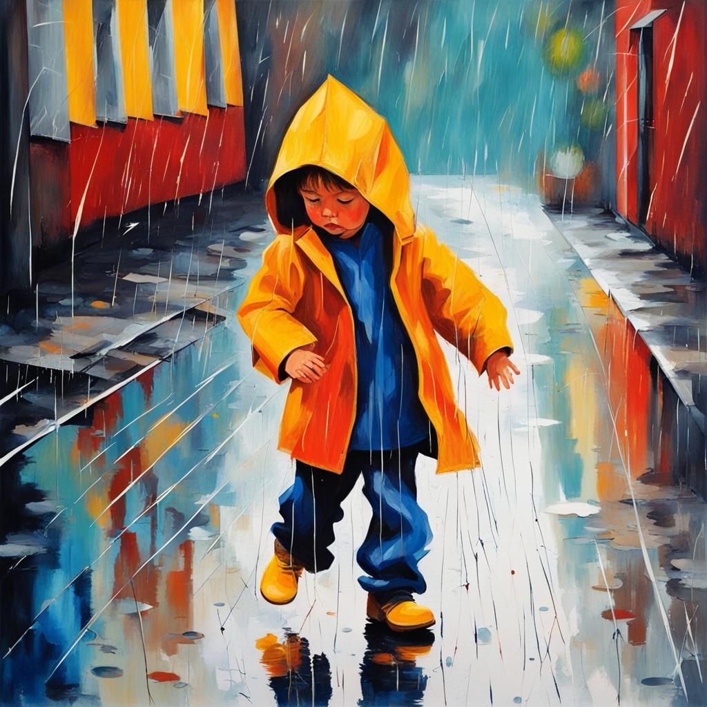 A vibrant abstract image of a rainy street scene, featuring a young boy dancing. The artwork employs complementary colors and fine details to create a captivating and dynamic scene.