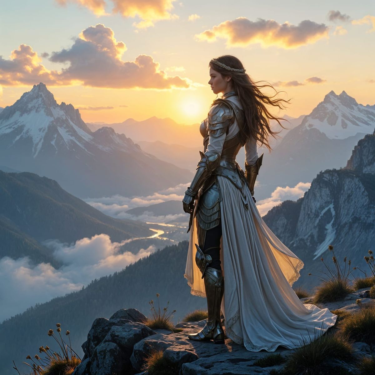 A striking picture of a valkyrie on a mountaintop, surveying a sunlit valley. The image captures a golden hour scene with soft light and intricate armor details, rendered in a hyperrealistic style.