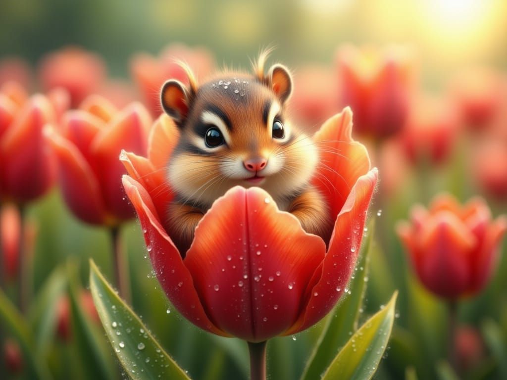 This image shows a tiny, smiling chipmunk nestled in a red tulip, with a garden of glistening tulips and soft morning light. Rendered in a painterly, hyperrealistic style with fantasy elements and detailed textures.