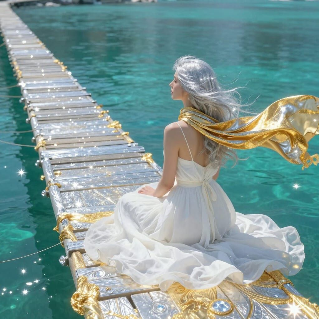 A woman in a flowing white dress sits on a luminous bridge of gold and silver, with a sparkling scarf and hair. The scene features glowing diamond stars and aqua water, rendered in a dreamy, ethereal fantasy art style.