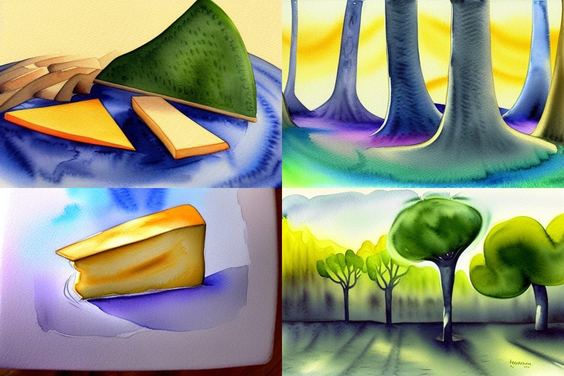 A surreal watercolor painting of cheese growing on trees. The artwork features a dreamlike landscape with cheese taking the place of fruit, rendered in delicate watercolor.
