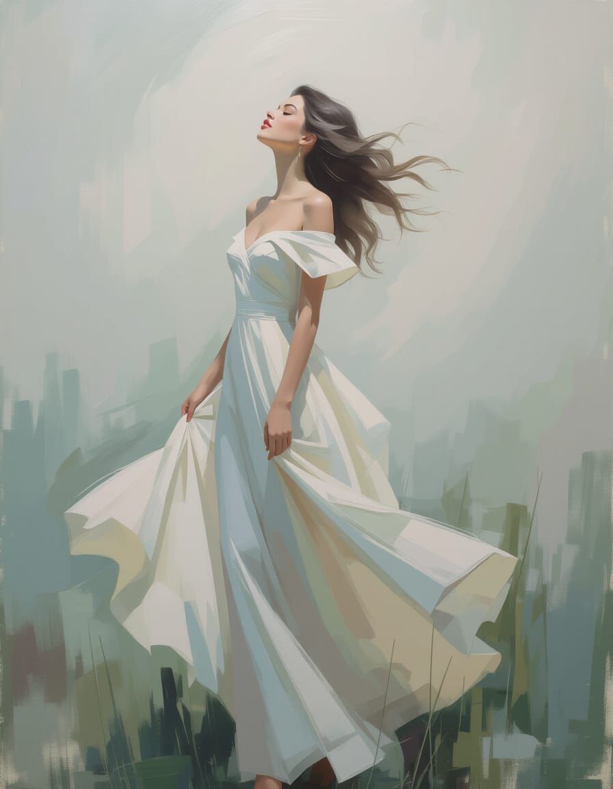 This image shows a romantic, impressionistic painting of a woman in a flowing dress, her hair caught in the wind. Soft, muted colors and expressive brushstrokes create a timeless, emotional feel.