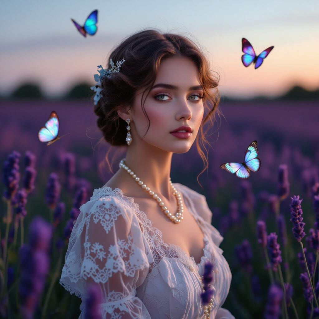 This image shows a woman in vintage attire standing in a lavender field at dusk, surrounded by butterflies. Rendered in a hyperrealistic digital style with cinematic lighting, it evokes pre-Raphaelite paintings.
