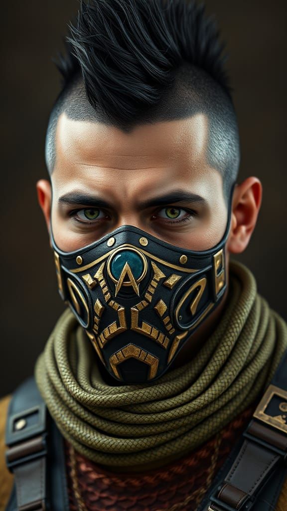 A hyperrealistic portrait of a short, muscular Ecuadoran man with a mohawk and green eyes. He's wearing an elaborate bushmaster-themed superhero costume and mask. The image is a digital rendering.