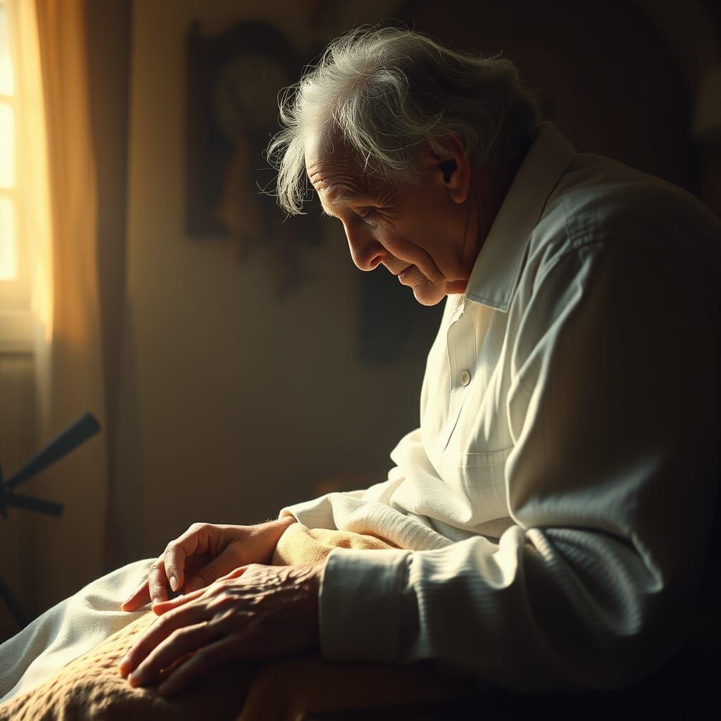 This serene image captures the last moments of life, surrounded by warm, golden light and soft shadows, evoking a sense of peace and acceptance, reminiscent of Andrew Wyeth's realism and Frida Kahlo's emotive style.