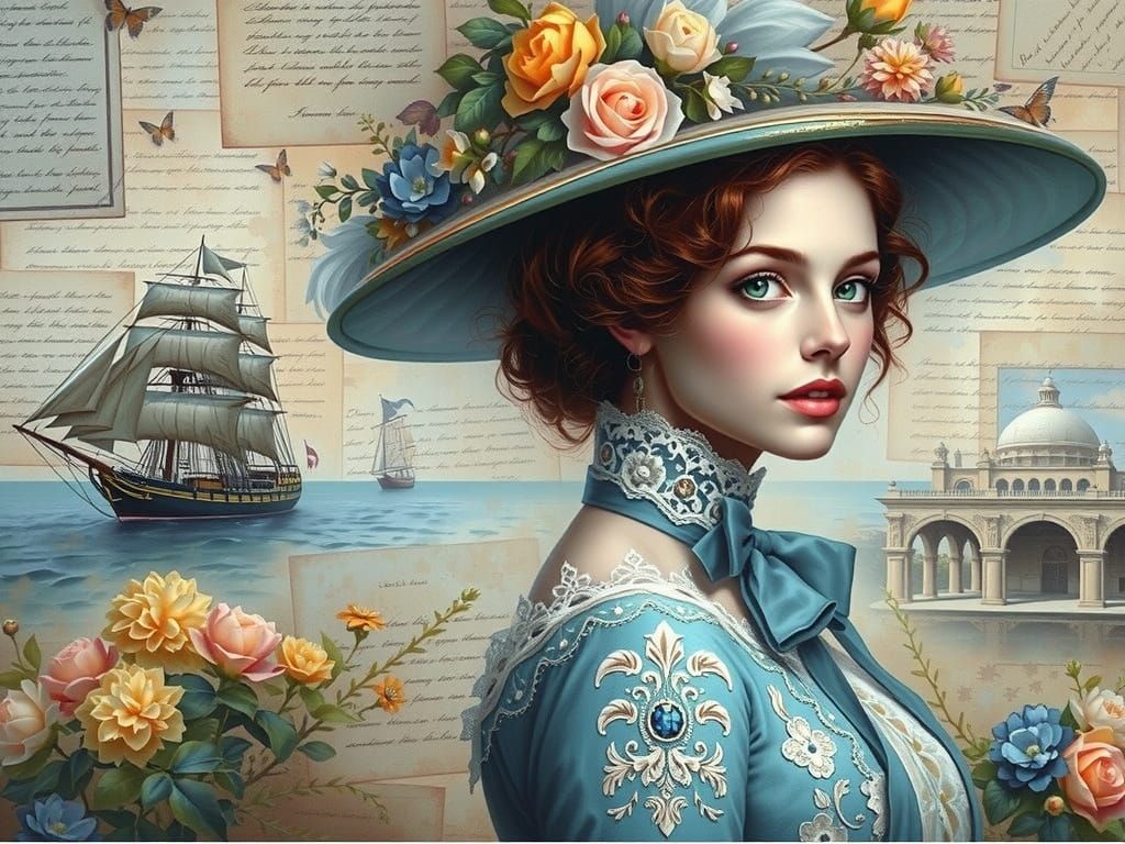 This image shows a woman with brown hair and green eyes wearing an elaborate blue dress and floral hat. The portrait is set against a backdrop of old manuscripts and a seascape, in a romantic vintage style.