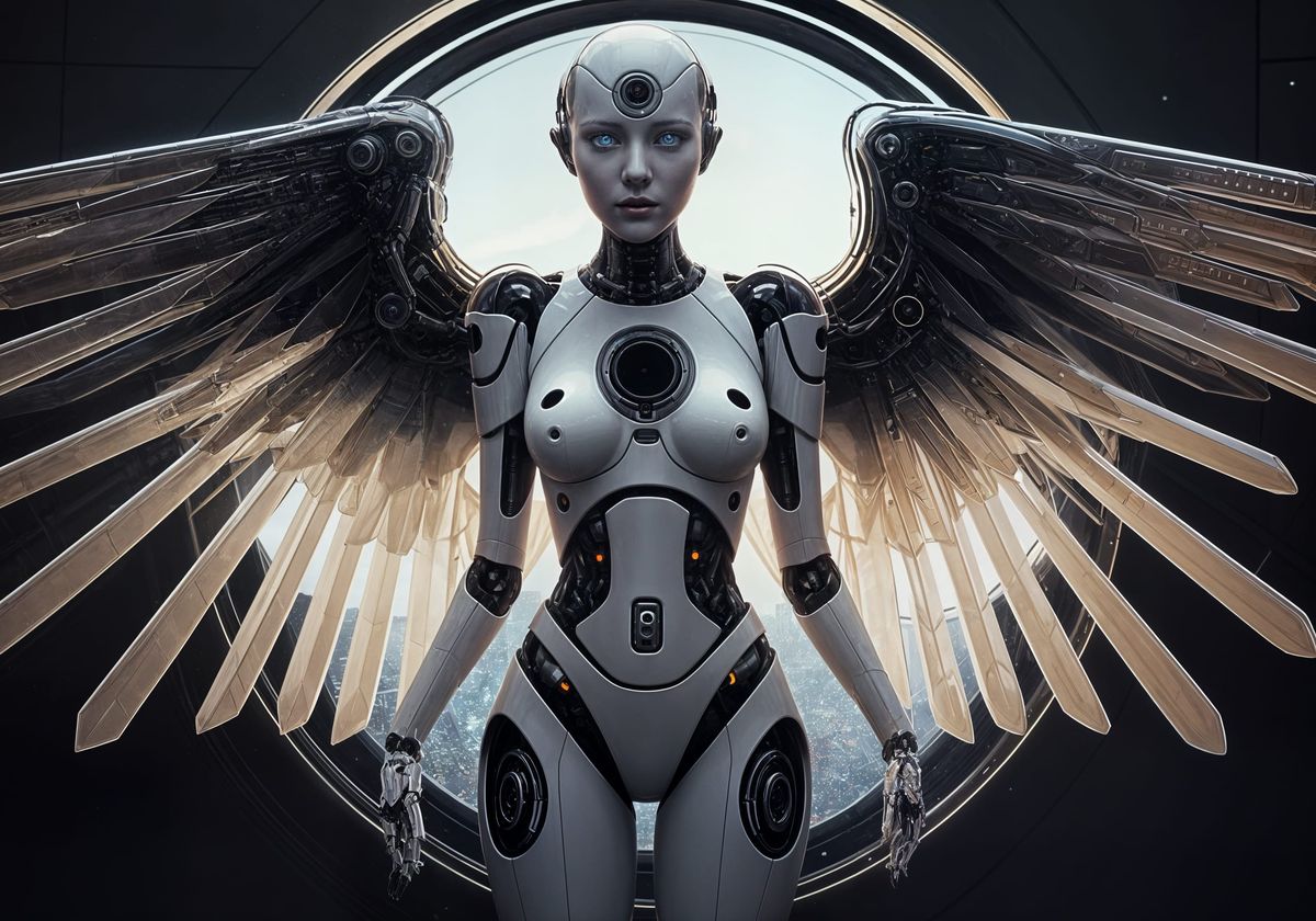 This image shows a futuristic android with angelic wings, set against a backdrop of a sci-fi mechanical heaven with a window to the cosmos, featuring a sleek and shiny metallic aesthetic.