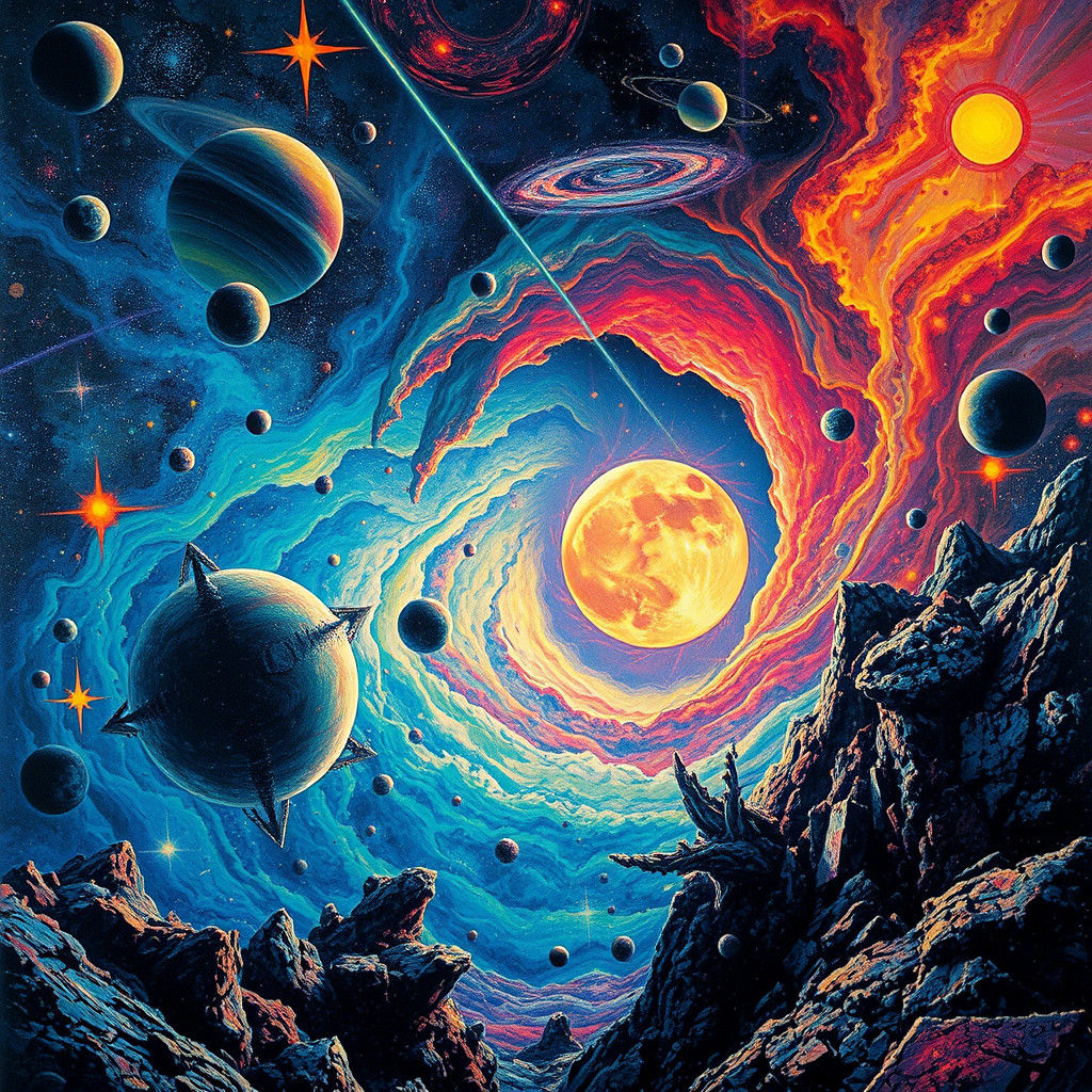 A surreal image showing the universe collapsing into a vortex of stars and galaxies. The artwork evokes abstract expressionism with distorted forms and vibrant colors, creating an eerie and sublime scene.