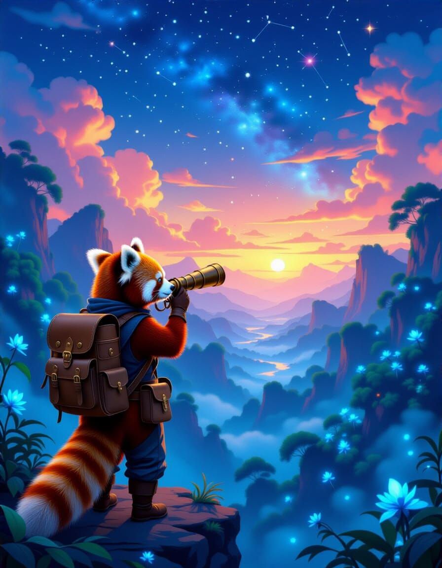 A red panda explorer, equipped with a vintage brass telescope and a worn leather backpack, stands on a cliff overlooking a vast, alien jungle filled with bioluminescent flora. The sky is a deep indigo, dotted with unfamiliar constellations. The art style is a realistic oil painting with a focus on atmospheric perspective and dramatic lighting, evoking a sense of adventure and discovery.