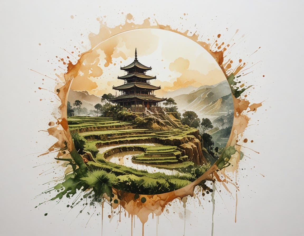 This image captures a golden hour monsoon with rain creating prismatic sheets over emerald rice terraces, silhouetting a pagoda amidst fog and molten mirror-like paddies. Rendered in a stylized watercolor aesthetic.