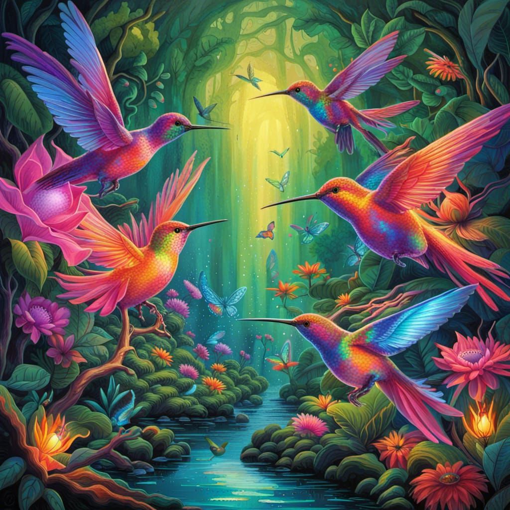 A vibrant image of a futuristic jungle scene where nature and technology merge. Robotic animals roam among neon flora under a rainbow sky, rendered as splash art.