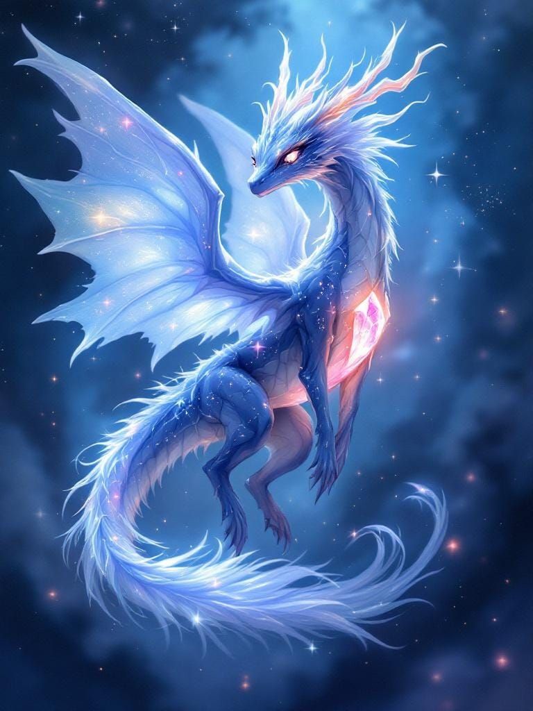 A captivating image of an ethereal silver and blue wyvern with stardust wings, floating in a twilight dreamscape. The artwork features soft colors reminiscent of impressionist paintings.