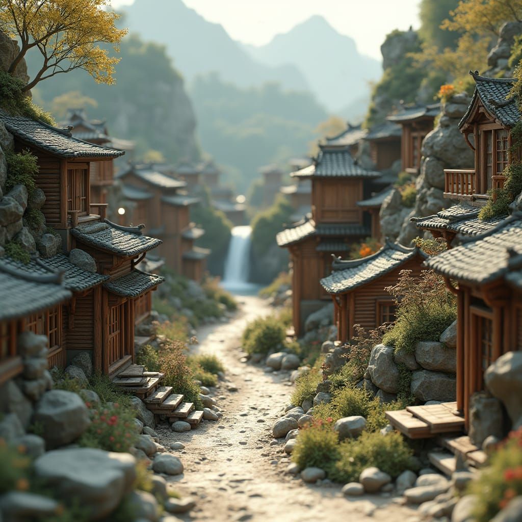 A serene, 3D computer-generated diorama of a traditional Chinese village, set amidst a winding landscape with a cascading waterfall and lush vegetation, blending futuristic and natural elements in a charming, secluded community