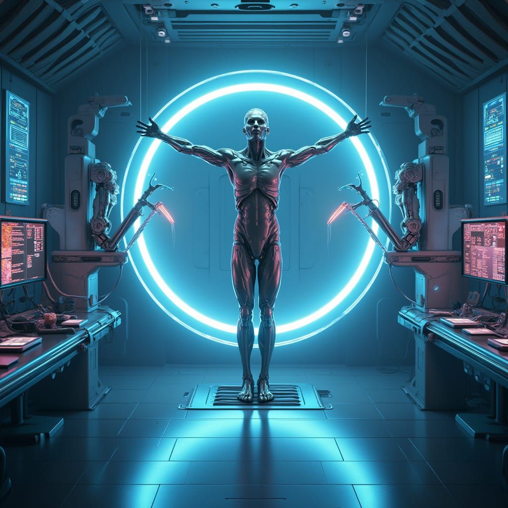 A cinematic image showing a cyborg suspended in a futuristic surgical chamber. The scene features advanced technology, a robotic surgeon, and holographic displays, all illuminated with cool neon lighting.
