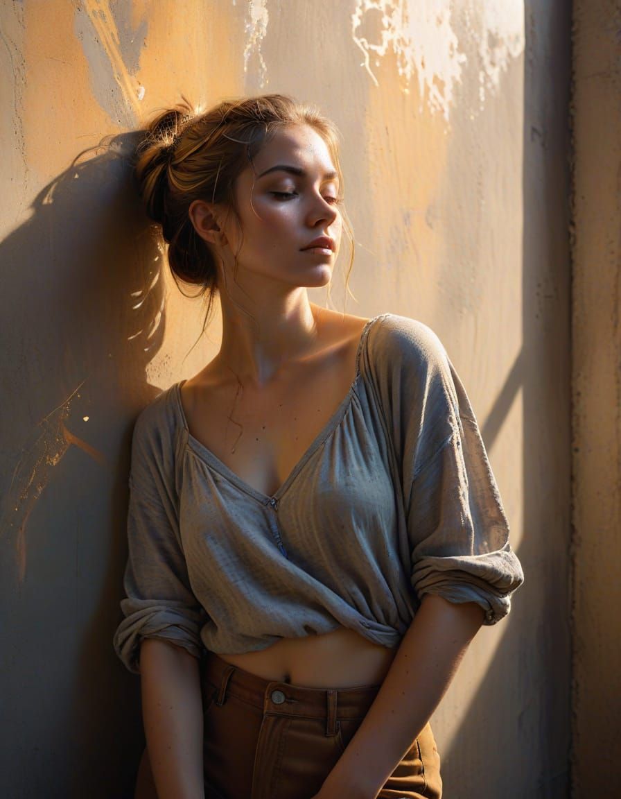 This image shows a young woman in a contemplative pose against an ethereal graffiti background. The image is rendered as a high-resolution watercolor wash with chiaroscuro lighting and baroque sensibility.