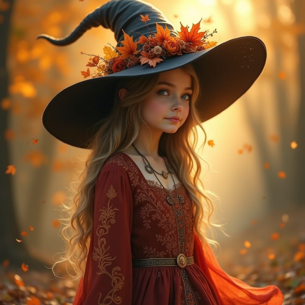 This image shows a beautiful young witch bathed in golden light. She wears a flowing gown with mystical symbols, and a hat adorned with autumn leaves and flowers, rendered with whimsical details and earthy tones.