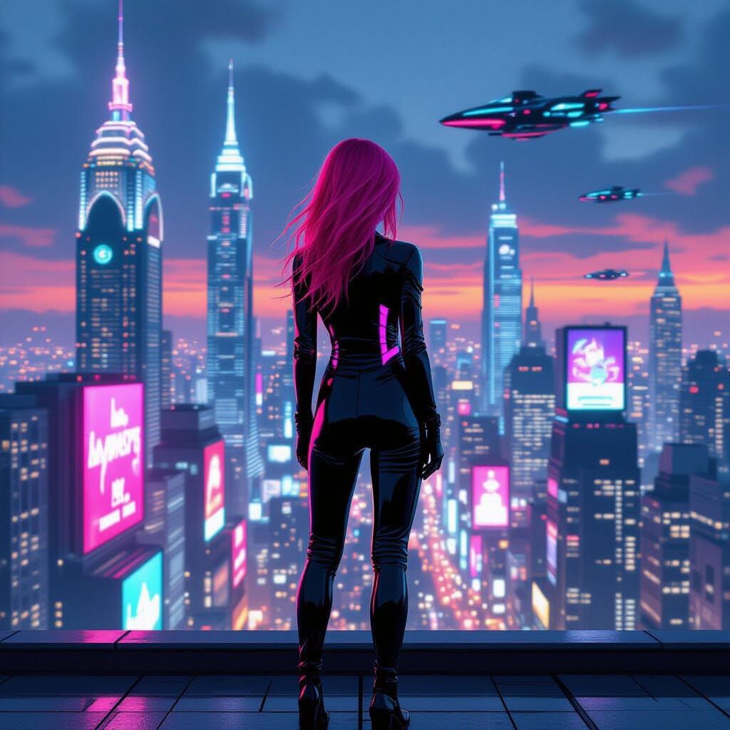 A striking picture of a girl with neon pink hair on a rooftop. She wears a black jumpsuit with iridescent accents, overlooking a futuristic city as digital art.