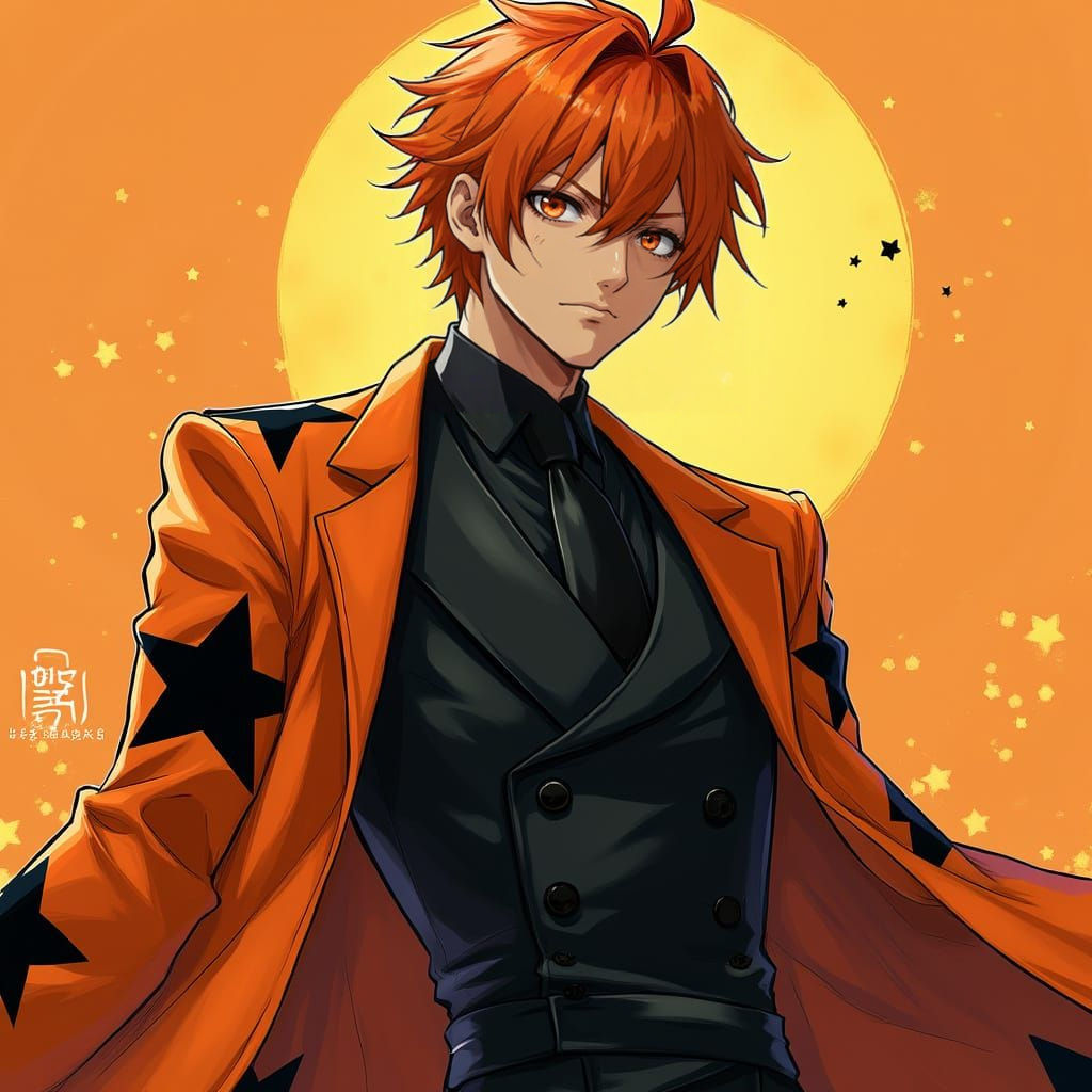 "A fierce looking man, with full black suit, and a orange haori with black stars , hairs are set, dark orange hairs by artist "anime", Anime Key Visual, Japanese Manga, Pixiv, Zerochan, Anime art, Fantia"
