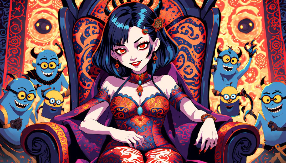 This image shows a vampire queen in a chair surrounded by her minions. The portrait is an ink illustration with intense colors, oriental patterns, and glowing talismans. It evokes a dark fantasy with horror elements in a supernatural manga style.