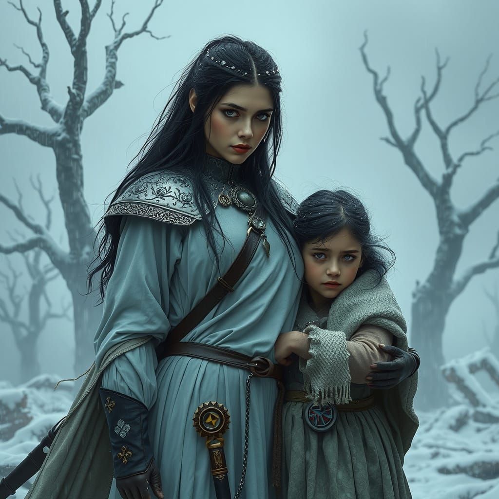 A striking picture of a woman warrior with black hair in a white dress protecting a little girl. The scene is set in a post-apocalyptic winter landscape, rendered with hyperrealistic and cinematic qualities.
