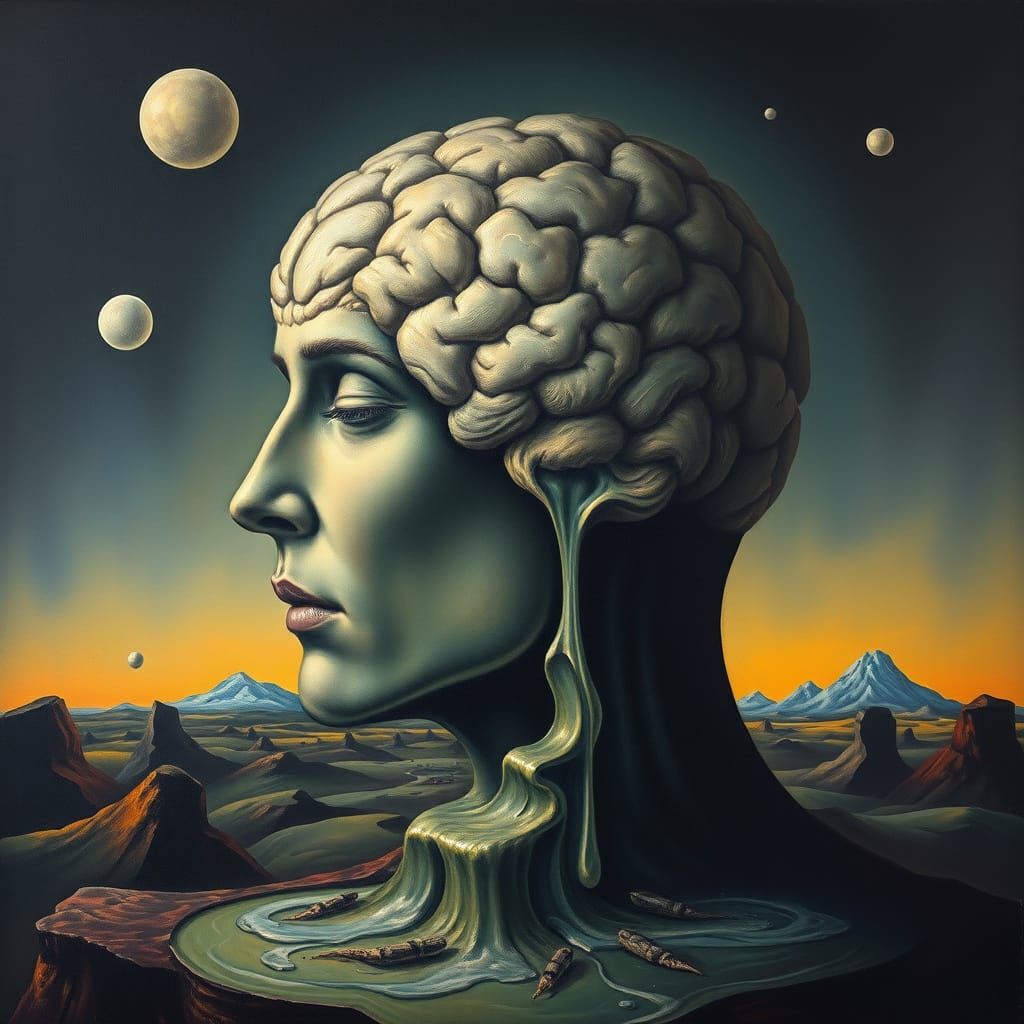 This image depicts a surreal escape from a rigid world, showing deep sounds and peaceful transcendence. Rendered as a matte oil painting.