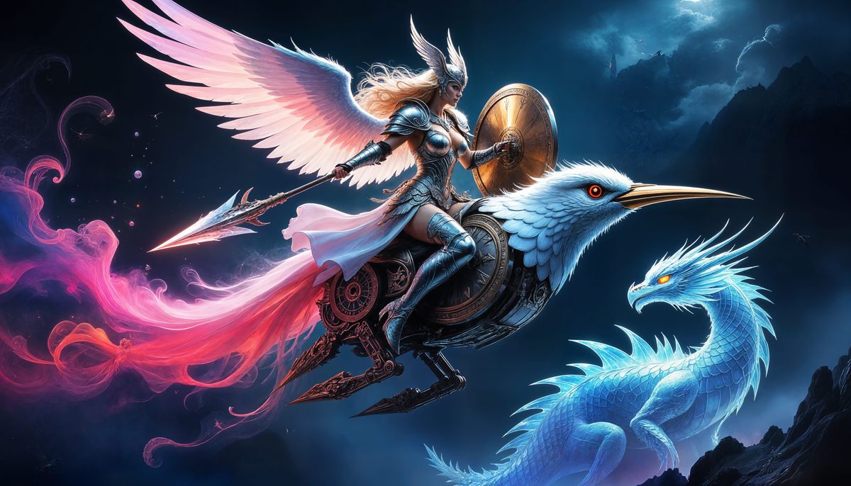 This image shows Valkyrie Brunhild fighting a crystal dragon on a mechanical hummingbird. The artwork features abstract surrealism and romanticism, with dramatic lighting and vibrant colors.