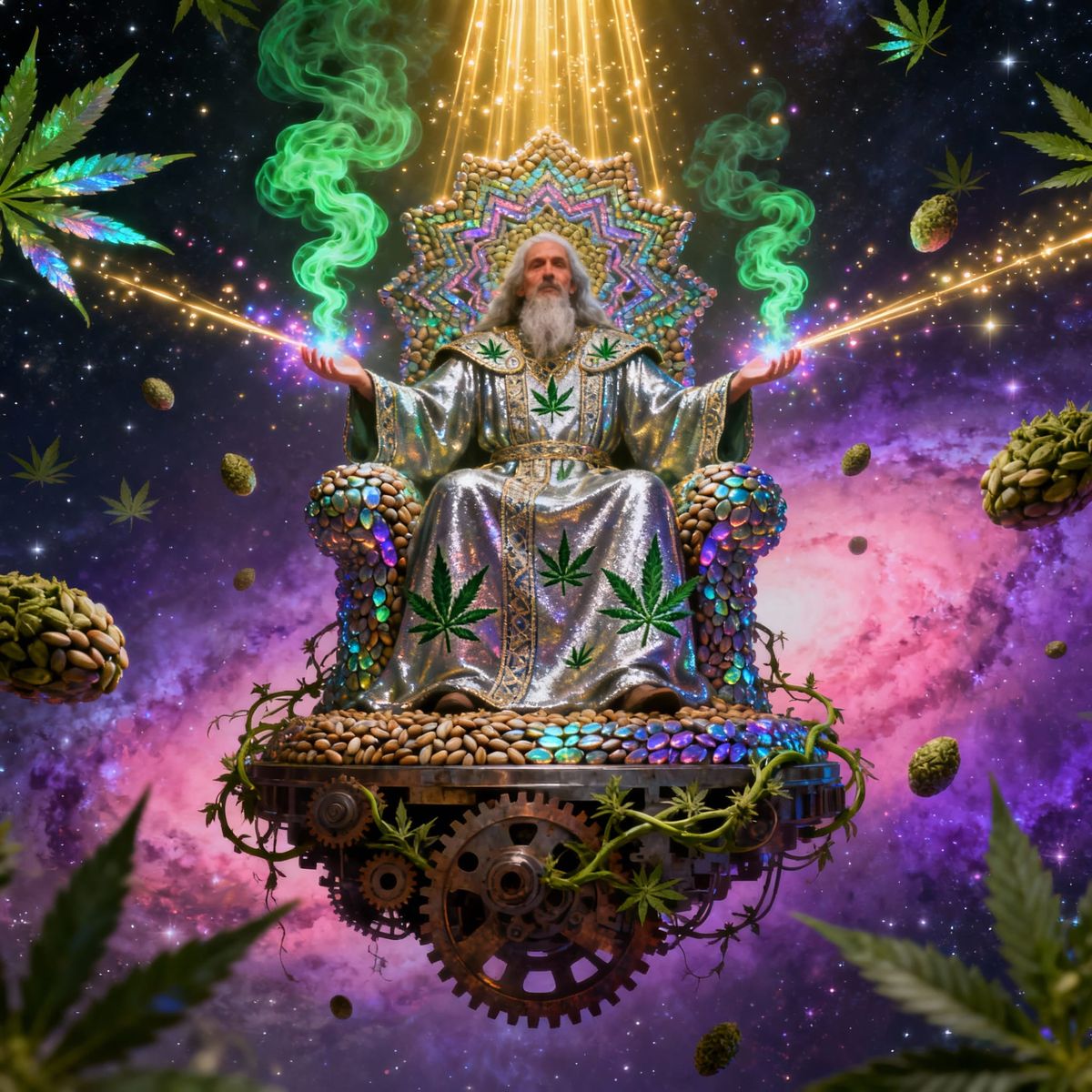 This image depicts a mystical cannabis fortune teller in ornate robes, ascending a cosmic throne made of seeds and light. The atmosphere is dreamlike and surreal, reminiscent of digital art styles.