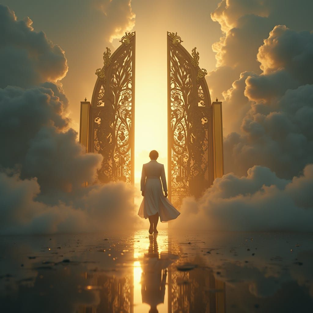 A scene of angels dressed in formal wear going into and out of the exclusive "Halo" nightclub, set in heaven with fluffy white clouds and golden gates. The image is hyperrealistic with high contrast.