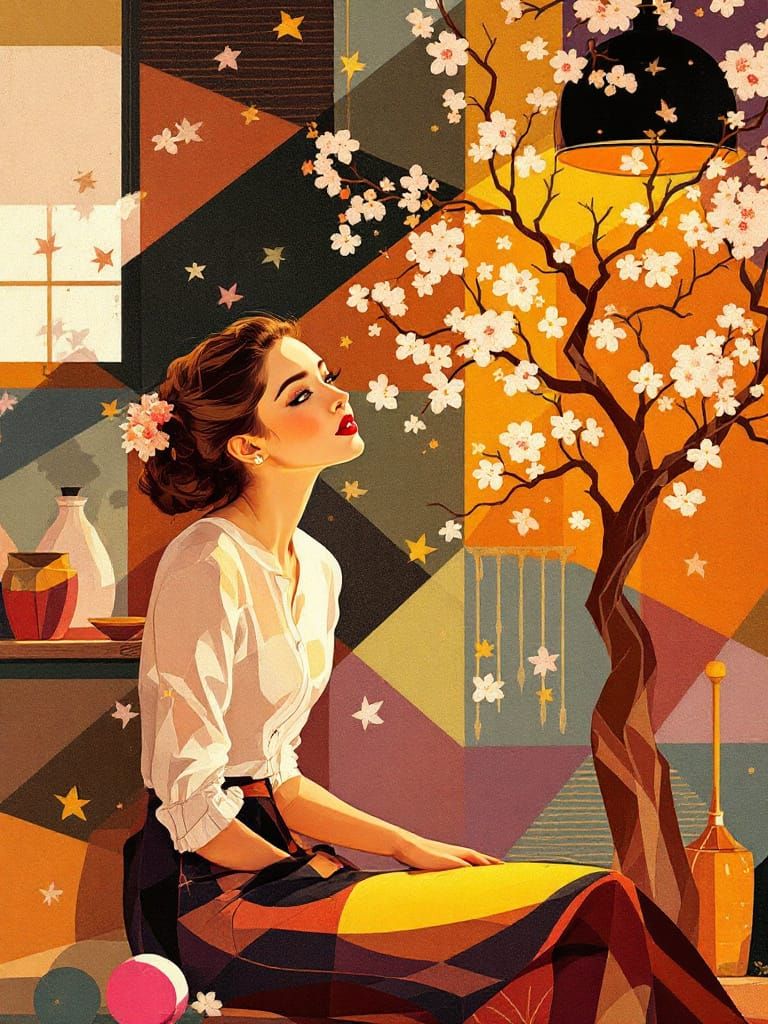 This image blends abstract geometric forms with a vintage pin-up figure in a retro garden. Features warm, nostalgic lighting and bold, balanced colors.