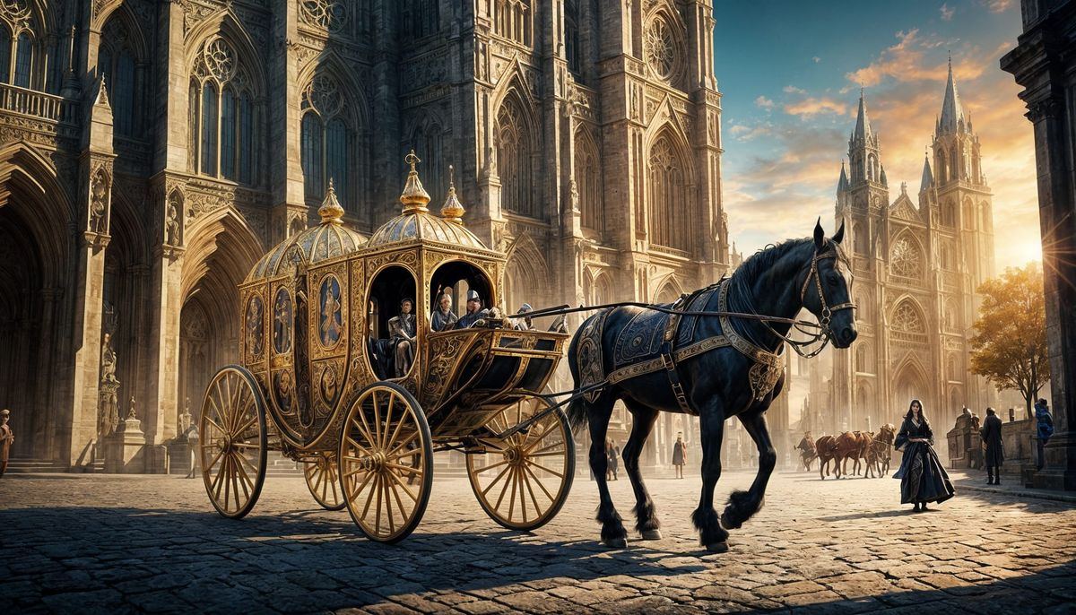 A vibrant digital painting of a gothic street scene with a cathedral. A horse-drawn golden carriage adds to the luxurious and ornate aesthetic in splash art style.
